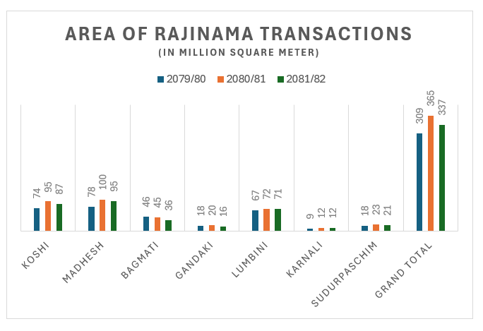 Total Area of Rajinama Transactions (in Million Square Meter) shows that the total land area transacted through Rajinama has followed a gradual upward trend, reflecting sustained activity in Nepal’s property market. The expansion in total area indicates not only an increase in transaction numbers but also a steady absorption of land into formal ownership structures.