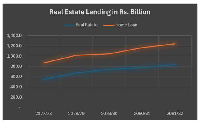 Insights from Real Estate Lending in Rs. Billion (Consolidated for Class A, B, and C Institutions) indicate that Bank and Financial Institutions (BFIs) have maintained significant exposure to the real estate sector, though growth patterns vary over time.