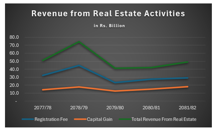 Revenue from Real Estate Activities in (Rs. Billion) shows that the government derives significant fiscal revenue from real estate transactions, primarily through registration fees, capital gains tax, and other transaction related charges.