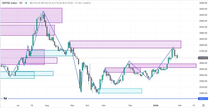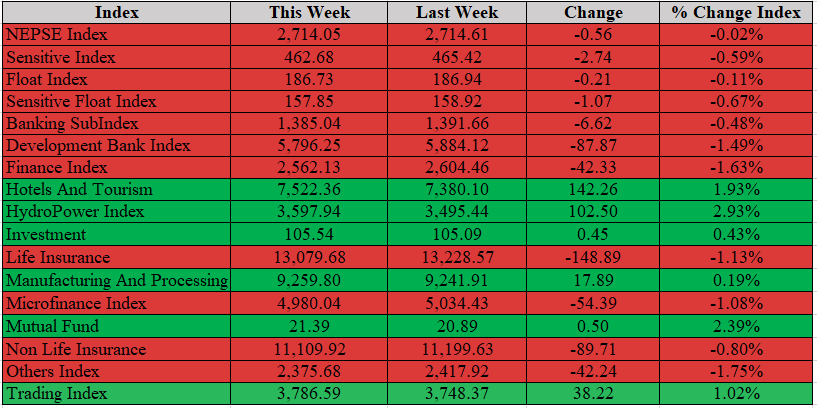 The NEPSE Index closed at 2,714.05, down 0.56 points (0.02%). The index closed at 2,714.61 last week, up 2.77% from the previous week.