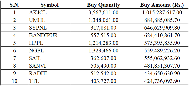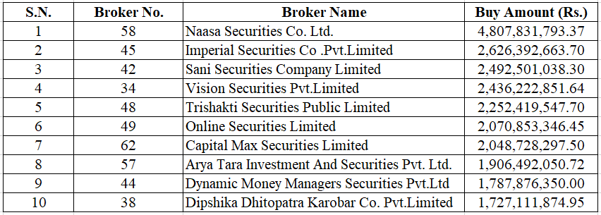This week, Naasa Securities Co. Ltd. (Broker No. 58) was the top buying broker and purchased stocks worth Rs. 4.80 Arba.