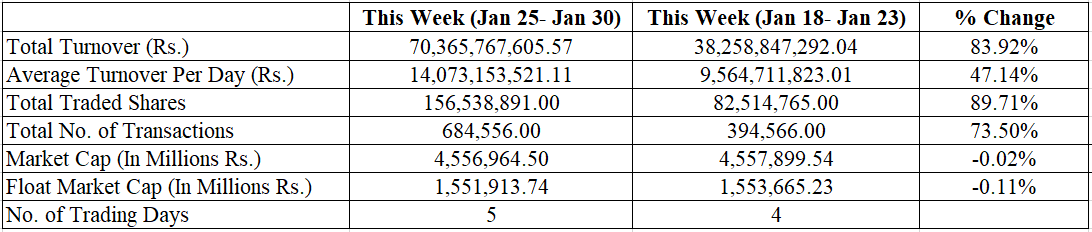 The highest intraday gain was 57.56 points on Sunday, with a turnover of Rs 13.78 Arba; however, the total turnover for the week stood at Rs 70.36 Arba.