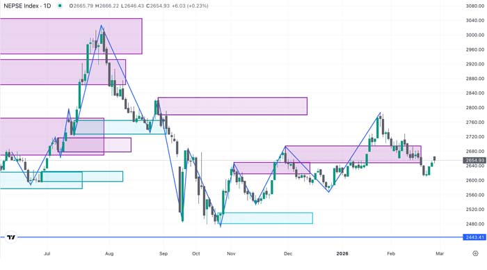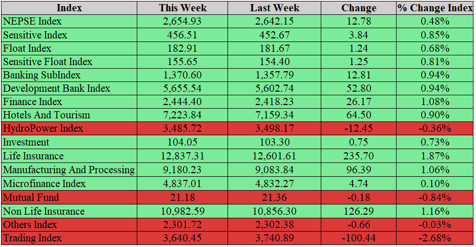 The NEPSE Index closed at 2,654.93, up 12.78 points (0.48%). The index closed at 2,642.15 last week, down 1.08% from the previous week.