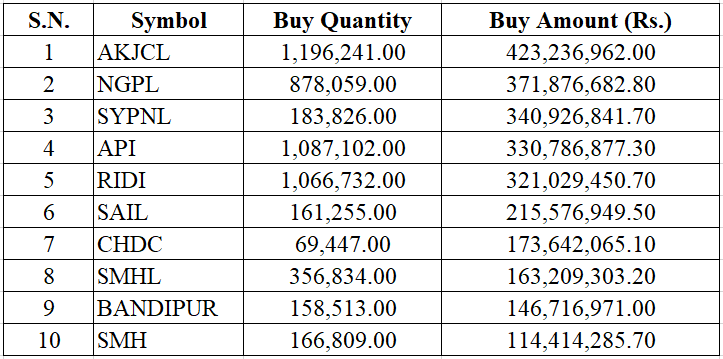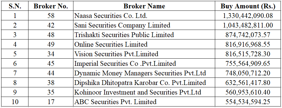 This week, Naasa Securities Co. Ltd. (Broker No. 58) was the top buying broker and purchased stocks worth Rs. 1.33 Arba.
