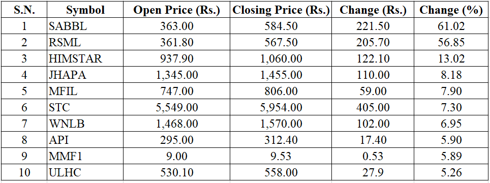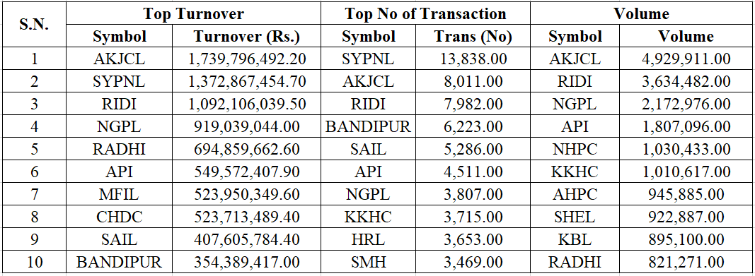 The highest intraday gain was 21.63 points on Tuesday, with a turnover of Rs 4.23 Arba; however, the total turnover for the week stood at Rs 24.69 Arba. Over 5.84 Crore unit shares have been traded through 2,70,388 transactions this week. The current market capitalization of NEPSE is Rs. 4,466,062.92 million, i.e., Rs 44.66 Kharba.