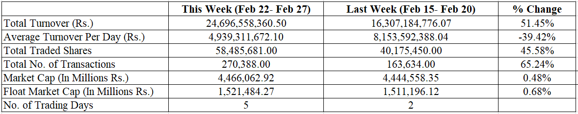 The highest intraday gain was 21.63 points on Tuesday, with a turnover of Rs 4.23 Arba; however, the total turnover for the week stood at Rs 24.69 Arba.