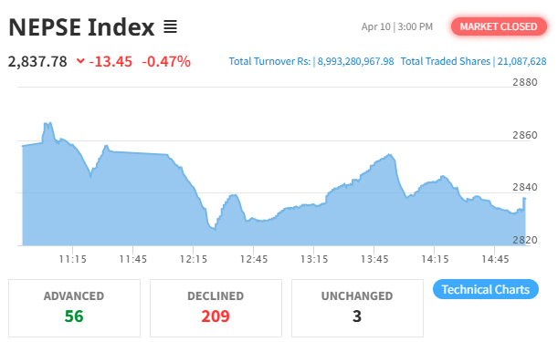 NEPSE Couldn't Sustain Yesterday's Gain, Dips By 0.47% to Settle at 2,837.78 Level