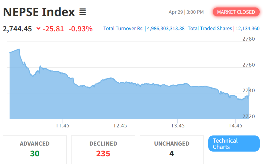 NEPSE Declines by Double Digits to Settle at 2,744.45 Level