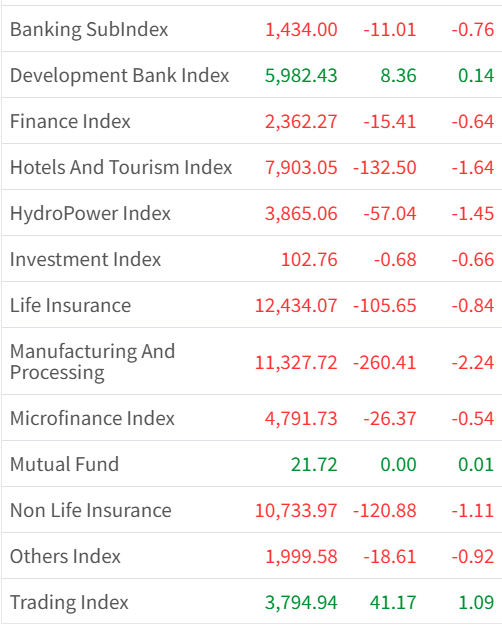 Among sectors, the Trading Index registered the highest gain, gaining 1.09%, while Hotels And Manufacturing And Processing index recorded highest fall, falling by 2.24%.