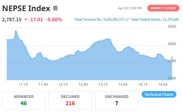 The Nepal Stock Exchange (NEPSE) recorded a loss today, declining by 17.01 points (0.60%) to settle at 2,787.15. This comes after a loss of 2.95 points in the previous trading session on yesterday.