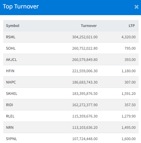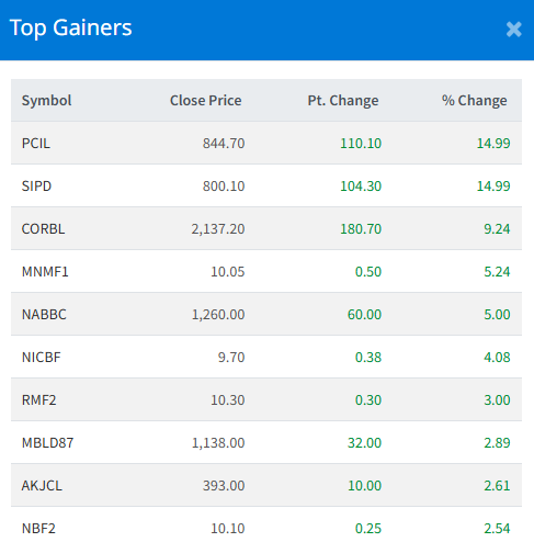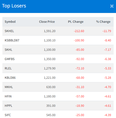 Meanwhile, Suryakunda Hydro Electric Limited (SKHEL) recorded the Highest fall, falling by 11.79%, the last traded price of the company was Rs. 1,591.20