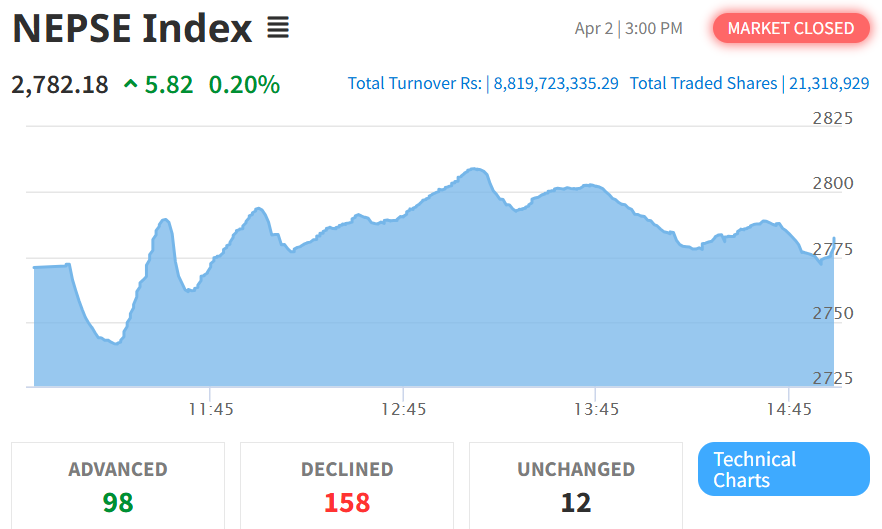 The Nepal Stock Exchange (NEPSE) recorded a moderate rise today, rising by 5.82 points (0.20%) to settle at 2,782.18.