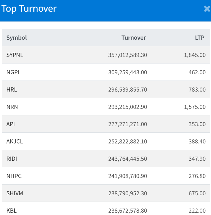 SY Panel (SYPNL) topped the turnover chart, amounting to Rs. 35.70 crores. The stock closed at Rs. 1,845.00.