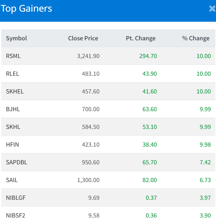 Five companies hit the upper circuit of 10% that includes RSML, BJHL, SKHL, RLEL, SKHEL and HFIN recorded 9.98% positive change in its prices.