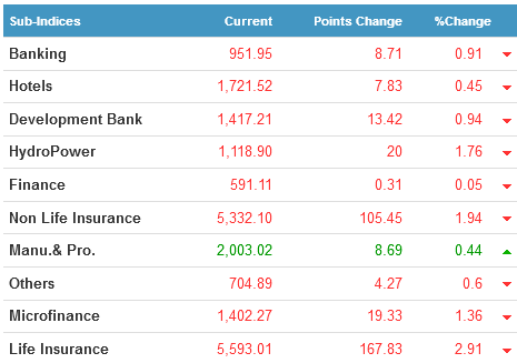 Manufacturing and Processing was the only sub-index in the green zone after it gained 0.44%. Rest of the sub-indices ended in the red zone after losing points. Top loser among them was Life Insurance sector after it lost 2.91% or 167.83 points.