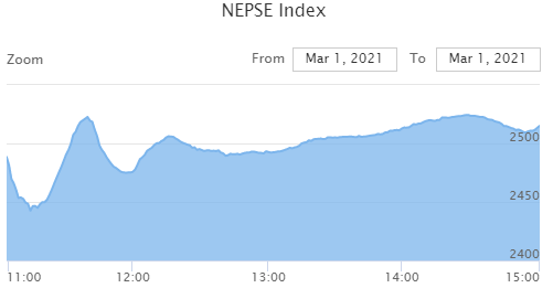The NEPSE index gained 40.64 points on a highly volatile day today and closed at 2,515.03. The index opened at 2,488.33 and made an intraday low at 2,442.60. The index gained in intraday action today, going as high as 2,524.4. With this, total volatility of 81.8 points was observed in the trading session today.