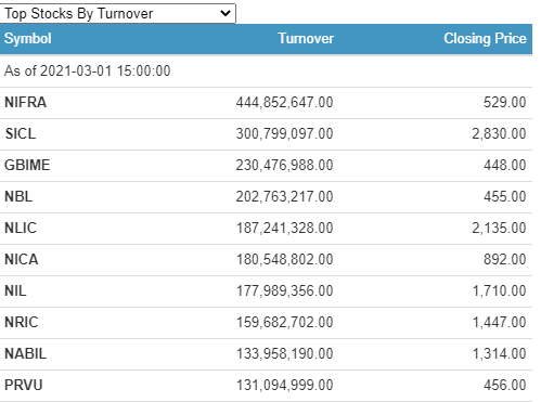 Nepal Infrastructure Bank Limited (NIFRA) has the highest individual scrip turnover of a little over Rs. 44.48 crores. The shares of Nepal Infrastructure Bank Limited (NIFRA) also traded the most.