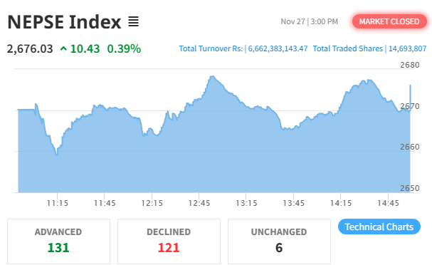 The Nepal Stock Exchange (NEPSE) recorded a gain today, gaining 10.43 points (0.39% ) to settle at 2,676.03. This follows a 9.61 point gain in the previous session.
