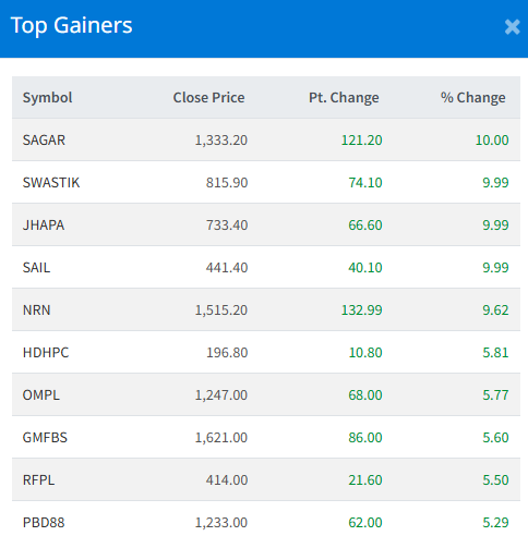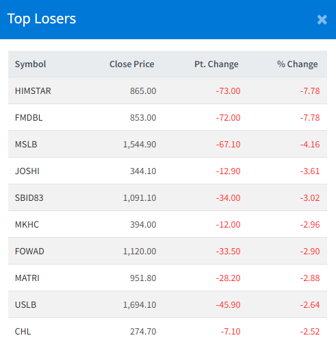 Meanwhile, Him Star Urja Company Limited (HIMSTAR) and First Micro Finance Laghubitta Bittiya Sanstha Limited (FMDBL) recorded the steepest drop, falling 7.78%.
