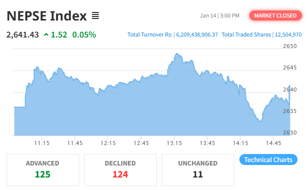 NEPSE Index Egdes Up By 1.52 Points To Close at 2,641.43; Overall Volume Stood at 6.20 Arba
