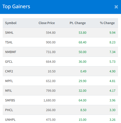 Super Madi Hydropower Limited (SMHL) led the gainer's list with 10.00% each.