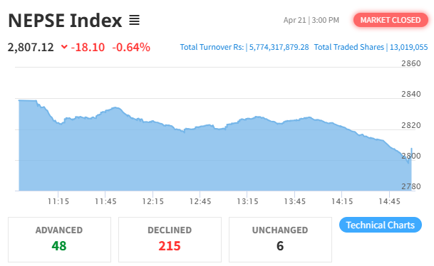 The Nepal Stock Exchange (NEPSE) recorded a double digit loss today, declining by 18.10 points (0.64%) to settle at 2,807.12. This comes after a loss of 13.17 points in the previous trading session on yesterday.