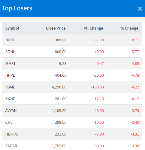 Meanwhile, Dolti Power Company Limited (DOLTI) recorded the Highest fall, falling by 8.71%, the last traded price of the company was Rs. 388.00