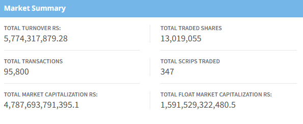 The benchmark index opened at 2,838.6 and reached an intraday high of 2,838.59, while the day’s low stood at 2,796.92. Total turnover for the day amounted to Rs. 5.77 Arba, with 13,019,055 shares traded across 347 companies through 95,800 transactions. The total market capitalization stood at Rs. 47.87 Kharba, with a float market capitalization of Rs. 15.91 Kharba.