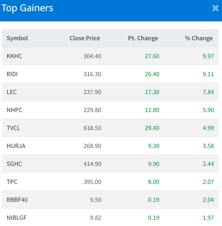 Khanikhola Hydropower Co. Ltd. (KKHC) led the gainers list with 9.97% each.