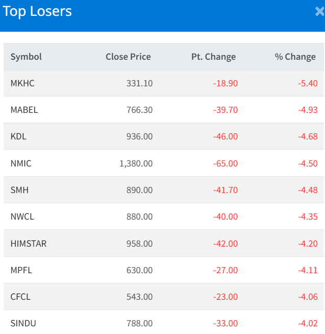Meanwhile, Maya Khola Hydropower Company Limited (MKHC) recorded the steepest drop, falling 5.40%.