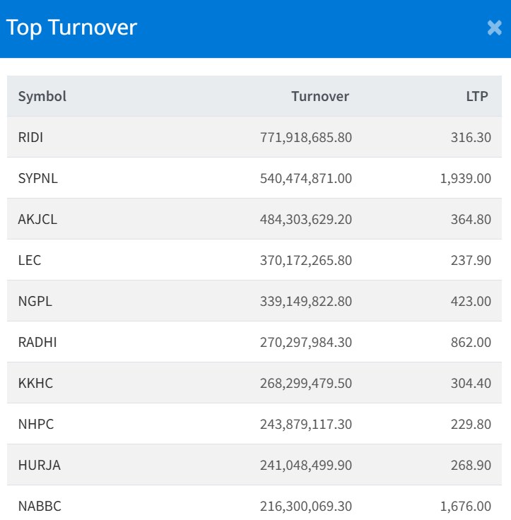 Ridi Power Company Limited (RIDI) topped the turnover chart, amounting to Rs. 77.19 crores. The stock closed at Rs. 316.30.