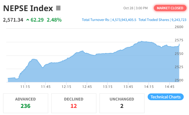 The Nepal Stock Exchange (NEPSE) recorded a gain today, gaining 62.29 points (2.48% ) to settle at 2,571.34. This follows a 5.19 -point gain in the previous session.
