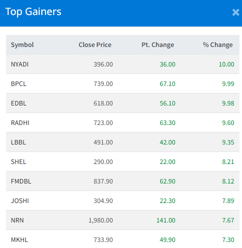 Nyadi Hydropower Limited (NYADI)and Butwal Power Company Limited (BPCL) led the gainer's list with 10.00%.