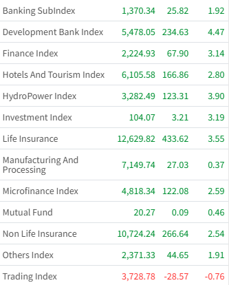 Among sectors, the Development Bank Index registered the highest gain, gaining 4.47%, while the Trading Index saw the highest loss at 0.76%.