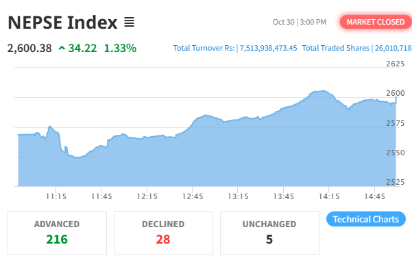 The Nepal Stock Exchange (NEPSE) recorded a gain today, gaining 34.22 points (1.33% ) to settle at 2,600.38. This follows a 5.17 -point loss in the previous session.