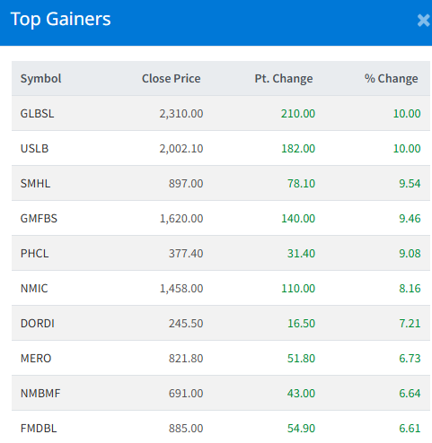 Gurans Laghubitta Bittiya Sanstha Limited (GLBSL) and Unnati Sahakarya Laghubitta Bittiya Sanstha Limited (USLB) led the gainer's list with 10.00%.