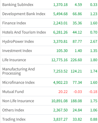 Among sectors, HydroPower Index registered the highest gain, gaining 2.67%, while the Mutual Fund saw the highest loss at 0.18%.