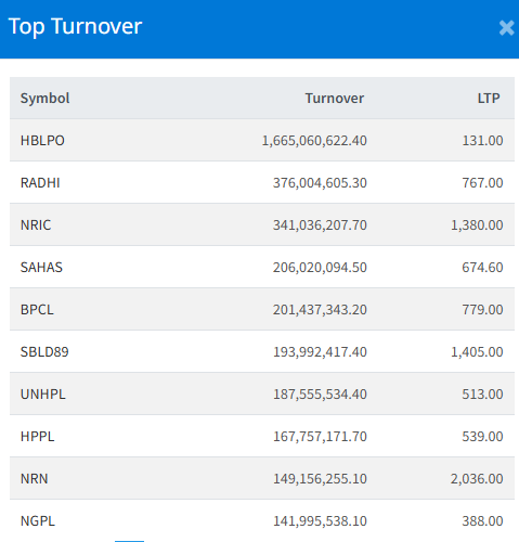 Himalayan Bank Ltd. Promoter (HBLPO) topped the turnover chart, amounting to Rs.1.66 Arba. The stock closed at Rs. 131.00.