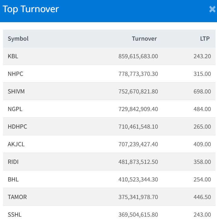Kumari Bank Limited topped the turnover chart, amounting to Rs. 85.96 crores. The stock closed at Rs. 243.20.