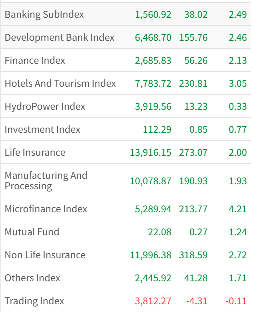 Among sectors, the Microfinance Index registered the highest gain, gaining 4.21%, and trading index recorded the small loss, loosing 0.11%. All index closes at green except Trading Index.