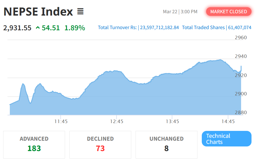 The Nepal Stock Exchange (NEPSE) recorded a gain today, gaining by 54.51 points (1.89%) to settle at 2,931.55. The index has gained 64.67 point in previous week last trading day (Thursday).