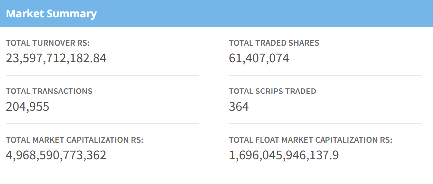 The benchmark index opened at 2890.08, touching an intraday high of 2,939.08 , while the lowest point was 2,890.68. Total turnover for the day reached Rs. 23.59 Arba, with 61,407,074 shares traded across 364 companies through 204,955 transactions. Market capitalization stood at Rs. 49.68 Kharba, with a float market capitalization of Rs. 16.96 Kharba.