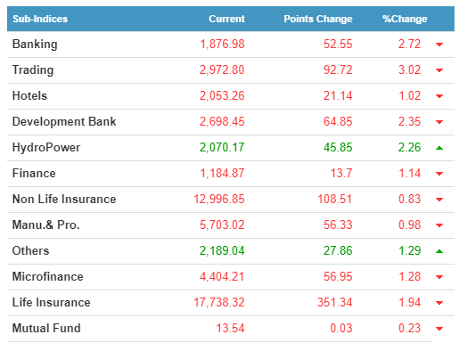 Only Hydropower and the "Others" sector gained, with Hydropower gaining the most 2.26%. Among all other sectors that closed red, Trading lost the most 3.02%.