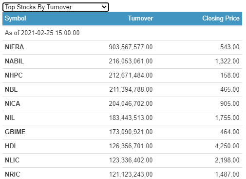 Nepal Infrastructure Bank Limited (NIFRA) has the highest individual scrip turnover of a little over Rs. 90.35 crores. Its shares also traded the most.