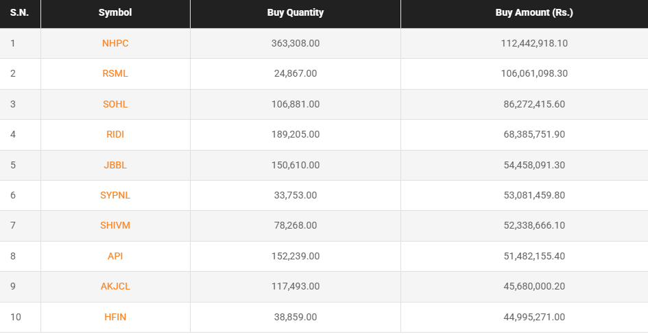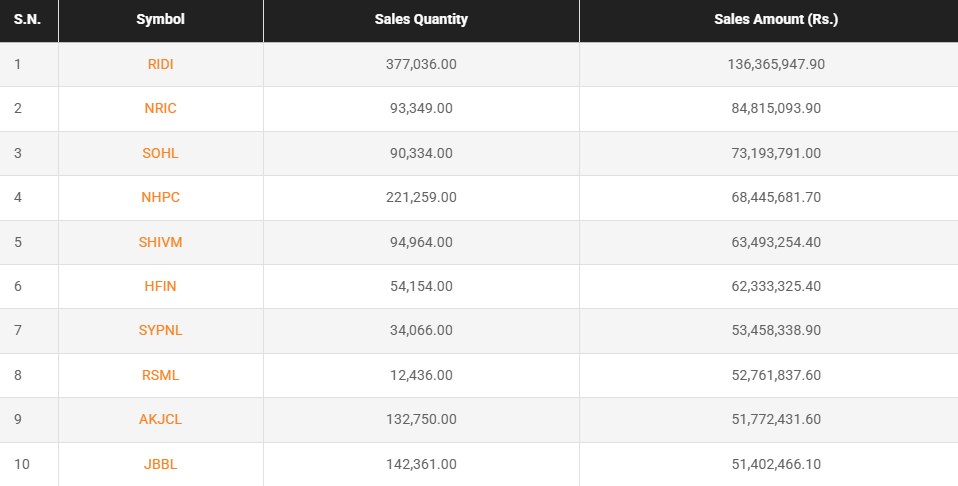 Ridi Power Company Limited (RIDI) topped the turnover chart, recording transactions worth Rs. 27.38 crores. The company’s stock closed at Rs. 362.00.