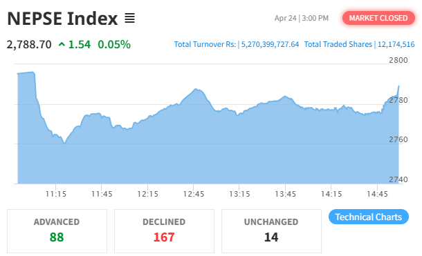 The Nepal Stock Exchange (NEPSE) recorded a modest gaini today, inclining by 1.54 points (0.05%) to settle at 2,788.70. This comes after a loss of 17.01 points in the previous trading session on yesterday.