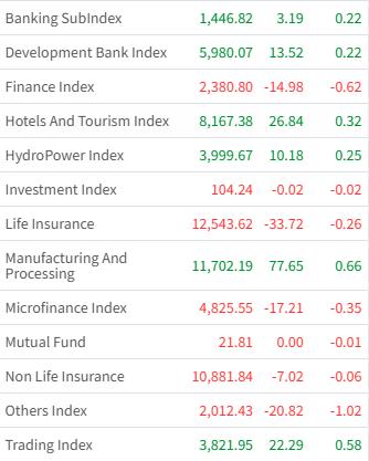 Among sectors, the Trading Index registered the highest gain, gaining 0.58%, while Others Index recorded highest fall, falling by 1.02%.