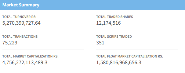 The benchmark index opened at 2795.22 and reached an intraday high of 2,795.98, while the day’s low stood at 2,759.54. Total turnover for the day amounted to Rs. 5.27 Arba, with 12,174,516 shares traded across 351 companies through 75,229 transactions. The total market capitalization stood at Rs. 47.56 Kharba, with a float market capitalization of Rs. 15.80 Kharba.