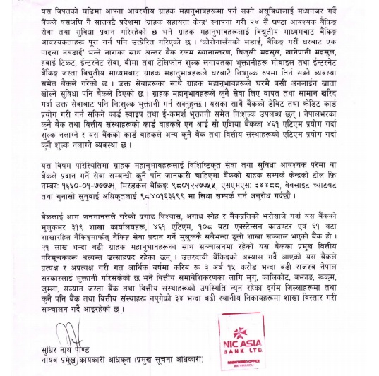 NIC ASIA bank has extended its interest rebate service where the borrowers of the bank who clear their interest till the month of Baisakh will receive further 10% rebate on interest amount and 100% refund of penal charges. Earlier, the bank had complied with Nepal Rastra Bank’s directives to provide 2% interest rebate on overall interest of the borrowers.