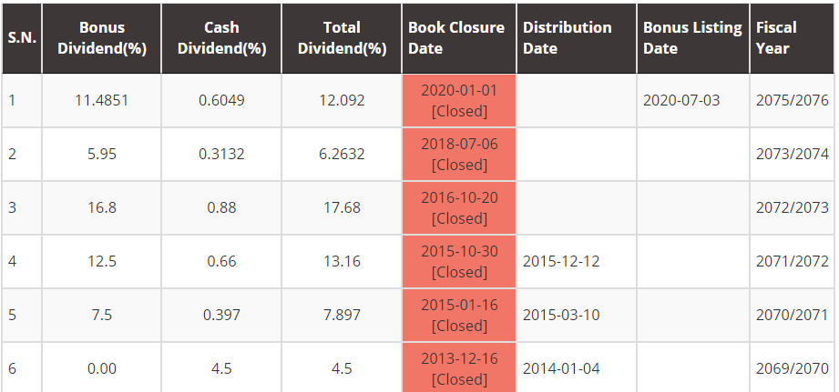The 307th meeting of the board of directors held on Falgun 06 has decided to not distribute any dividend. For the fiscal year 2075/76, the company had distributed an 11.4851% bonus shares and 0.6049% cash dividend.